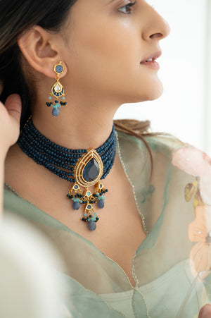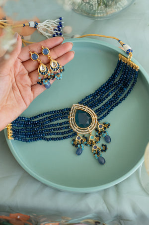 Handmade Blue Beaded Kundan Choker Necklace Set with Earrings