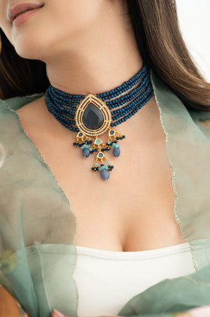 Make a royal statement with this handcrafted blue beaded Kundan choker necklace set. Featuring a multi-layer bead design, a gold-plated teardrop pendant with sparkling Kundan stones, and matching drop earrings, this set is perfect for weddings, receptions, and festive occasions. Lightweight, skin-friendly, and artisan-made for timeless elegance.