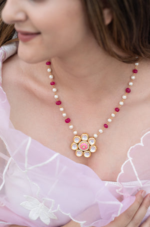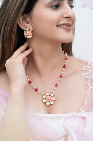 Celebrate tradition with elegance in this handcrafted festive kundan pendant necklace. Featuring a kundan motif with pearl and pink accents, a bold kundan pendant with crystal detailing, and a pearl-beaded chain interlinked with pearl & pink beads, this necklace is a true work of art.