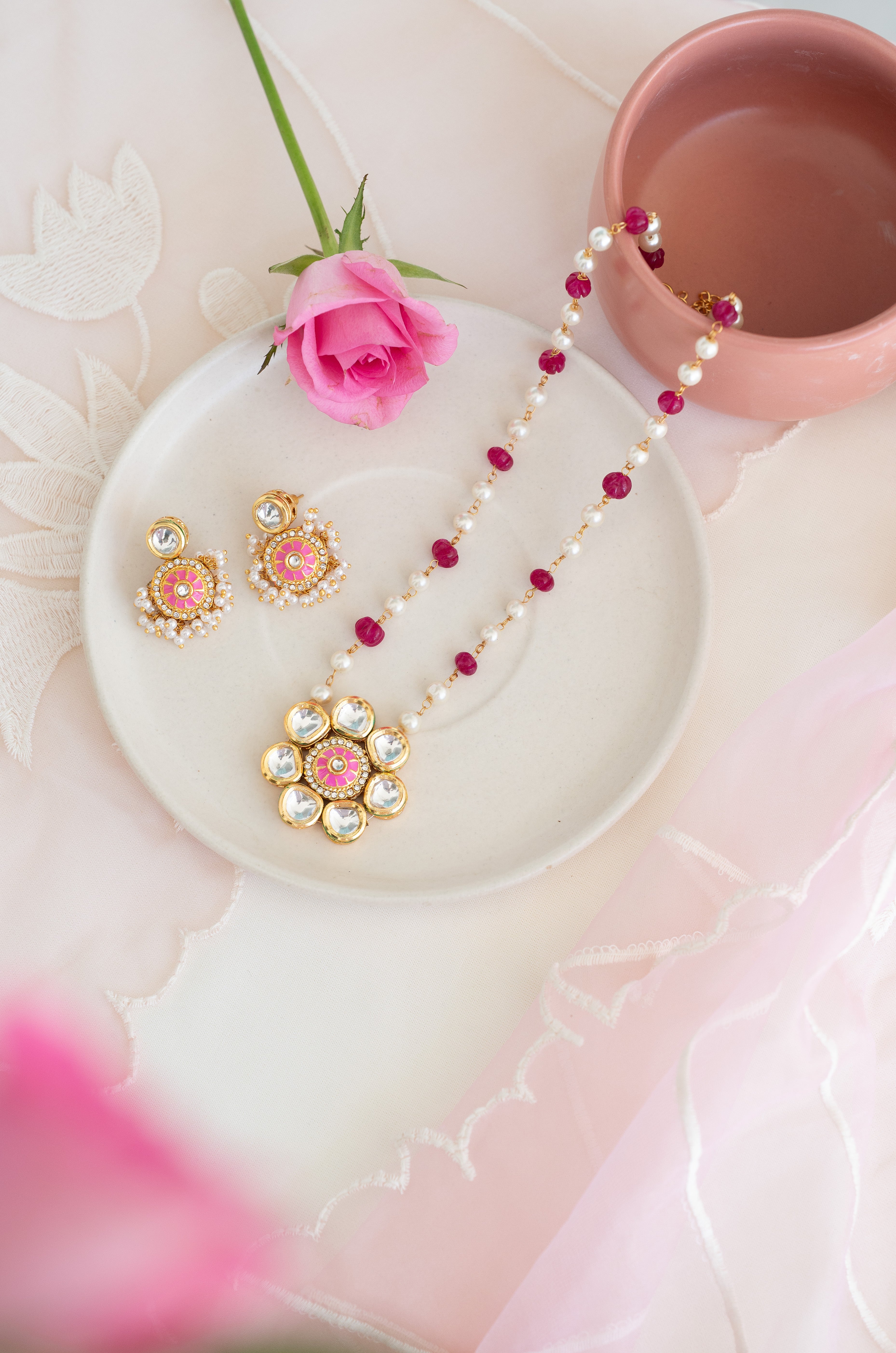 Hot Pink Stone Kundan Meenakari Beaded Pendant Set