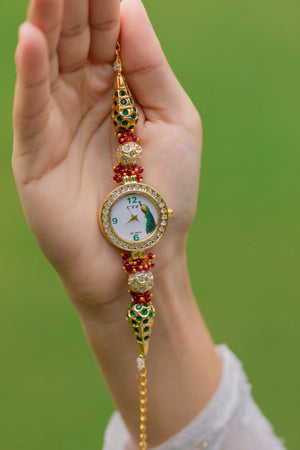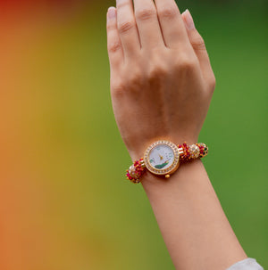 Enhance your style with our Jadau Beads Peacock Dial Wrist Watch. This exquisite timepiece features intricate peacock designs and traditional craftsmanship, perfect for any occasion