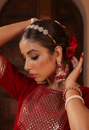A wedding or special occasion look is incomplete without the perfect set of Kundan jhumki earrings and a complementary kundan ring. These glimmering beauties are sure to make a statement, evoking an air of elegance and luxury that will leave you feeling like royalty. Experience sophistication and timelessness with this finely crafted set of stunning earrings and rings.