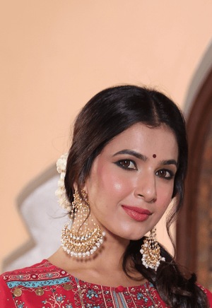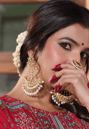 Indulge in luxurious elegance with these kundan chandbali earrings, handcrafted from dazzling crystals with intricately beaded pearls. Adorned with a graceful balance of opulence and delicate detail, these earrings are a timeless statement of exquisite taste.