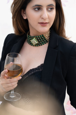Turn heads with this handcrafted Kundan choker necklace set, featuring five rows of lustrous beads, a Kundan meenakari pendant adorned with beads. Perfect for weddings, festive occasions, and gifting.