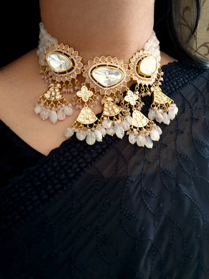 Elevate your style with this exquisite Designer Kundan polki Necklace set. Its intricate craftsmanship and regal charm make it the perfect statement piece