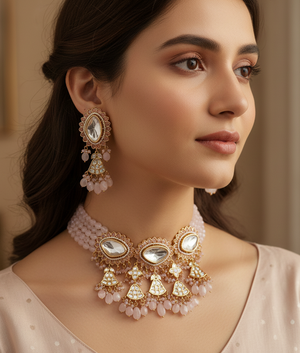 Kundan Polki Baby Pink Stone Beaded Necklace With Earrings