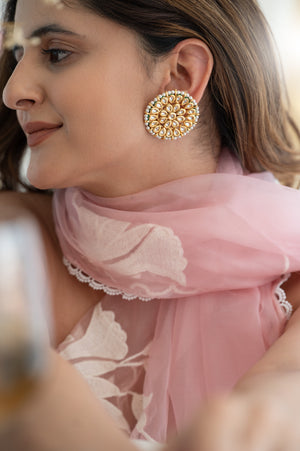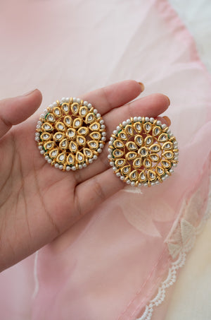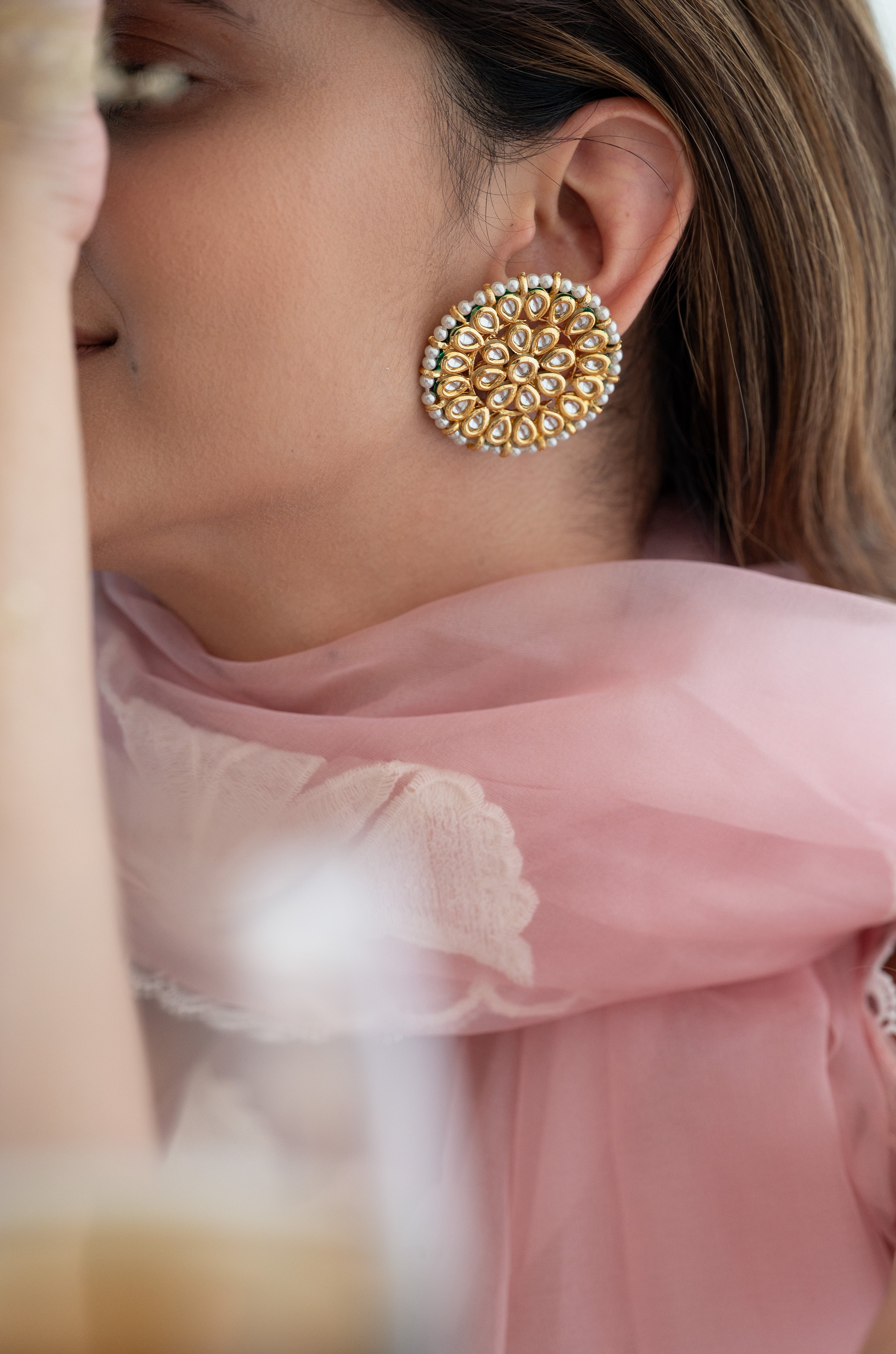 An elegant gold-tone Kundan polki stud earrings with the most stunning festoon. The perfect accessory for your occasion. These earrings are handcrafted with love