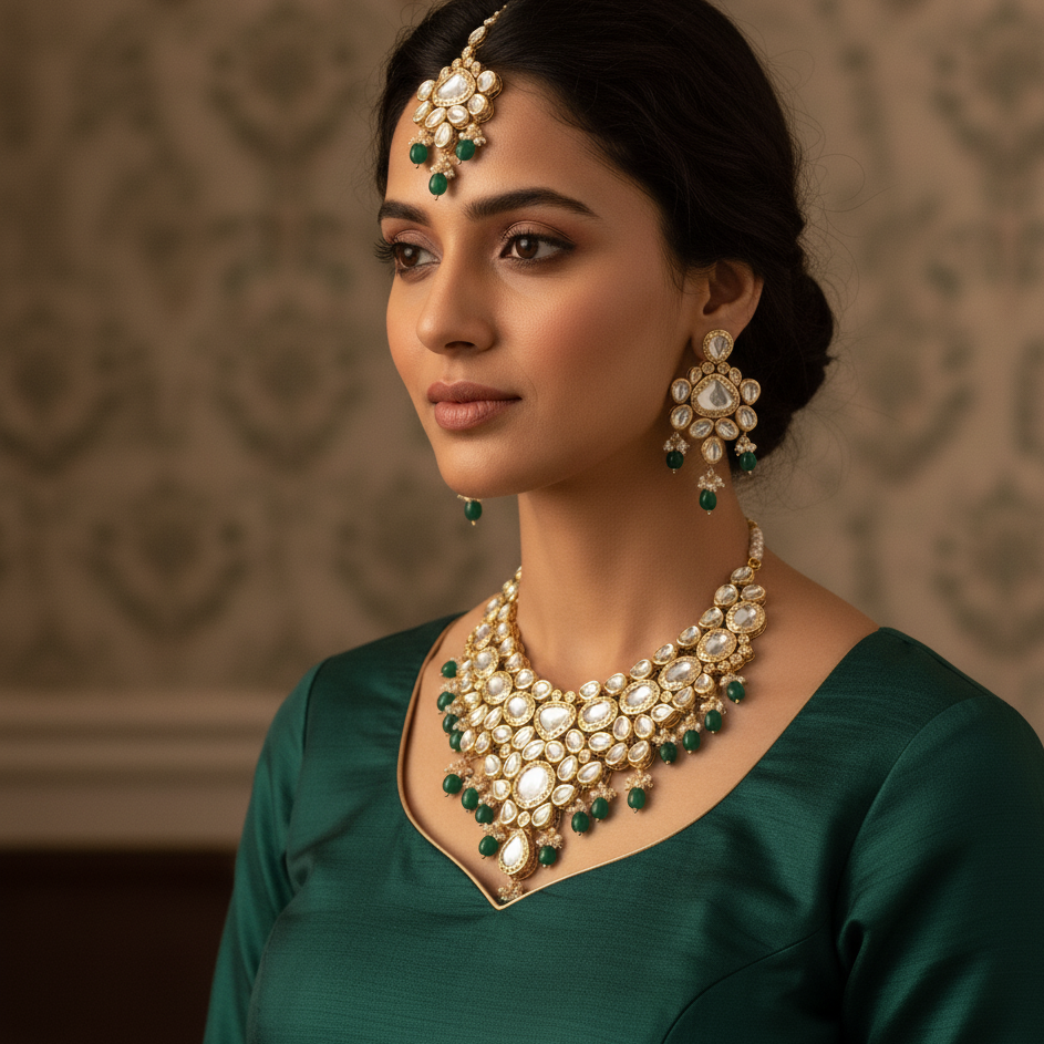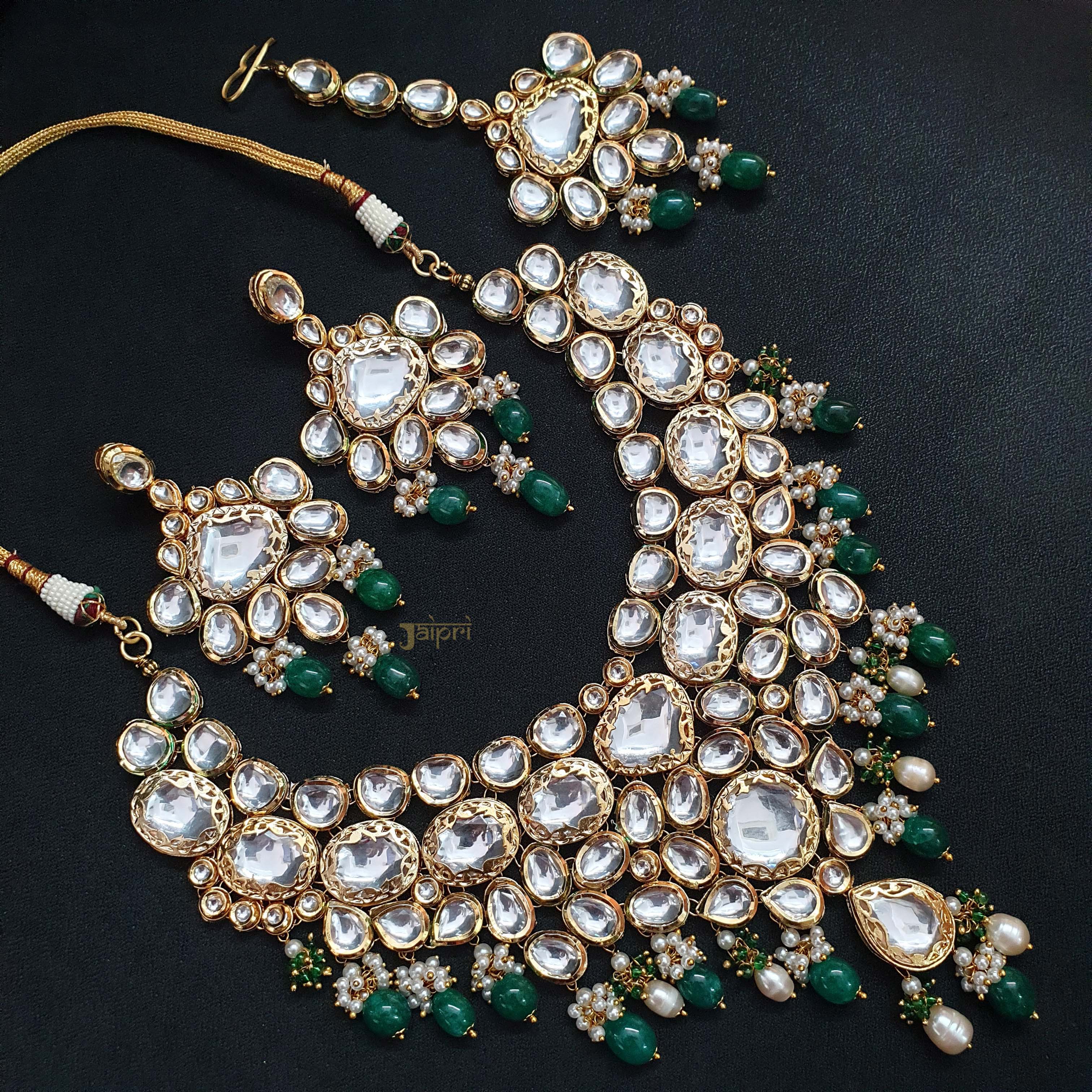 Kundan Polki Green Beaded Bridal Necklace, Earrings And Maangtikka