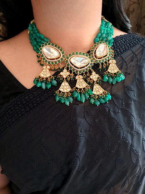 Kundan Polki Green Stone Beaded Necklace With Earrings