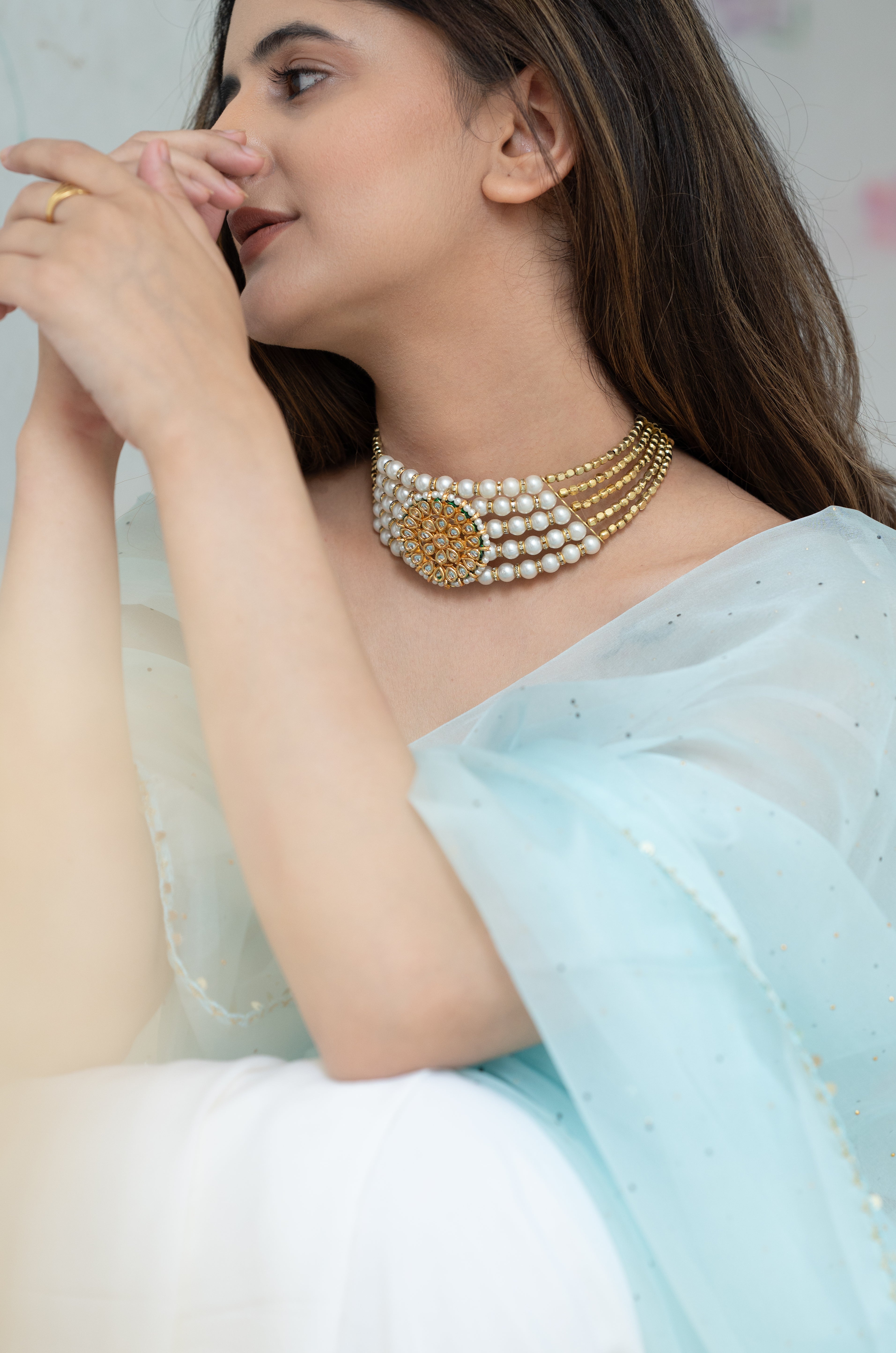 A timeless blend of pearls, Kundan accents that adds royal elegance to both ethnic and Indo-western outfits.