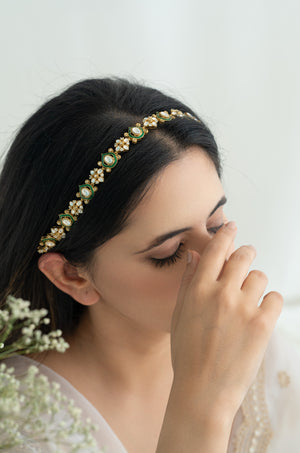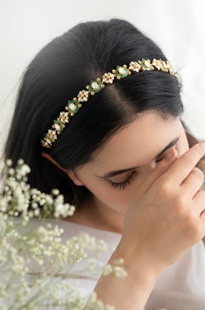 This handcrafted hairband combines intricate Kundan artistry with rich green enamel and clusters of lustrous pearls, creating a timeless and versatile hair accessory. Perfect for brides, bridesmaids, or festive occasions, it adds a regal finishing touch to any outfit. Its lightweight, comfortable fit ensures you can shine all day without compromise.