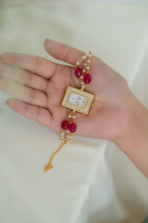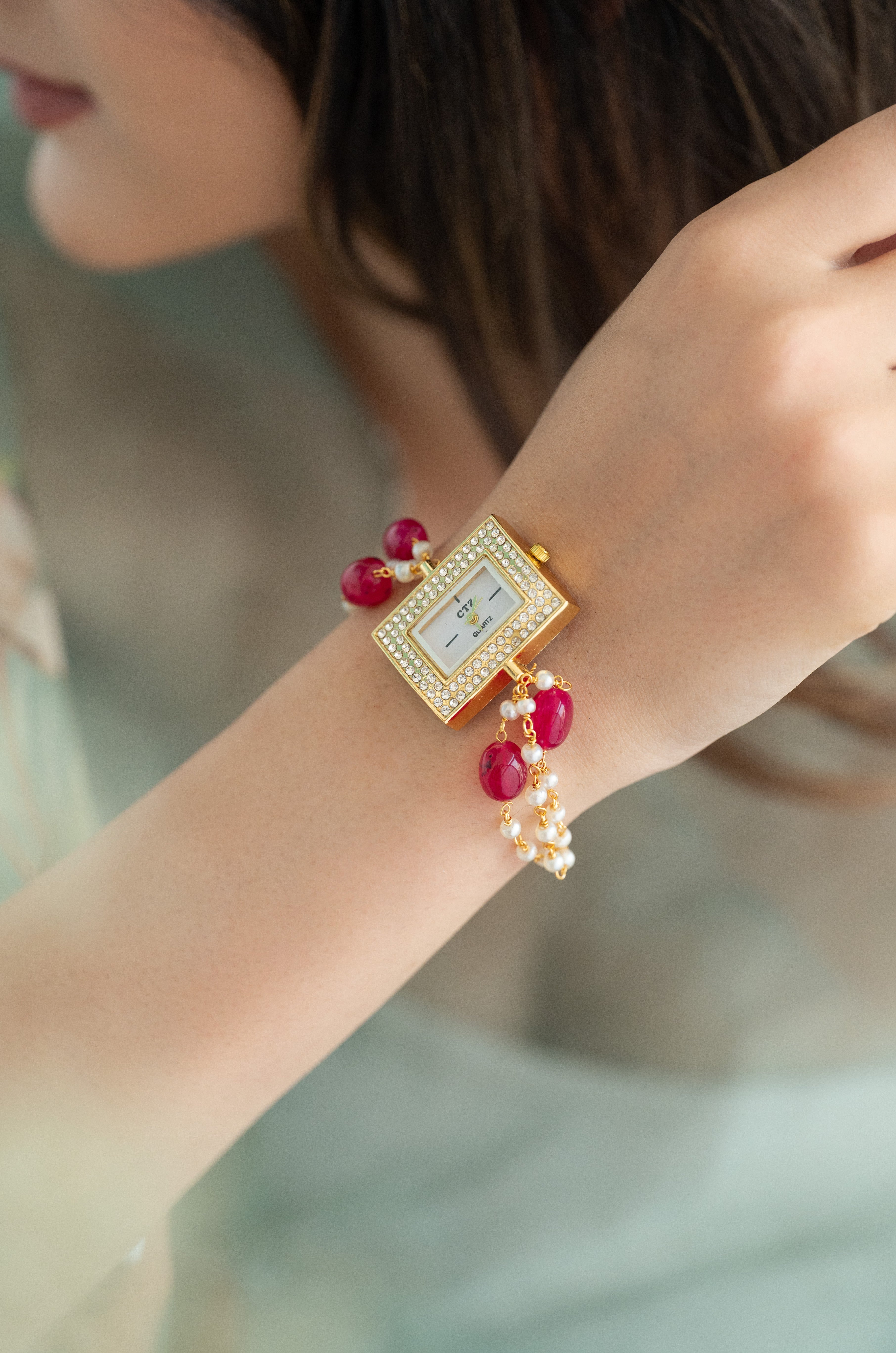 Make a bold statement with this luxury gold-plated rectangular dial watch, adorned with shimmering pearls and ruby-red beads. Designed to blend tradition with modern charm, it’s the perfect accessory for weddings, festive occasions, or everyday elegance.