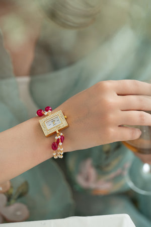 Luxury Gold Plated Rectangular Pearl and Ruby Beaded Wrist Watch