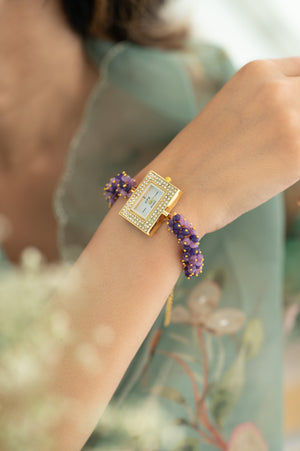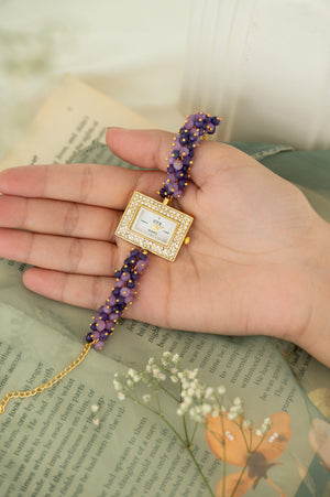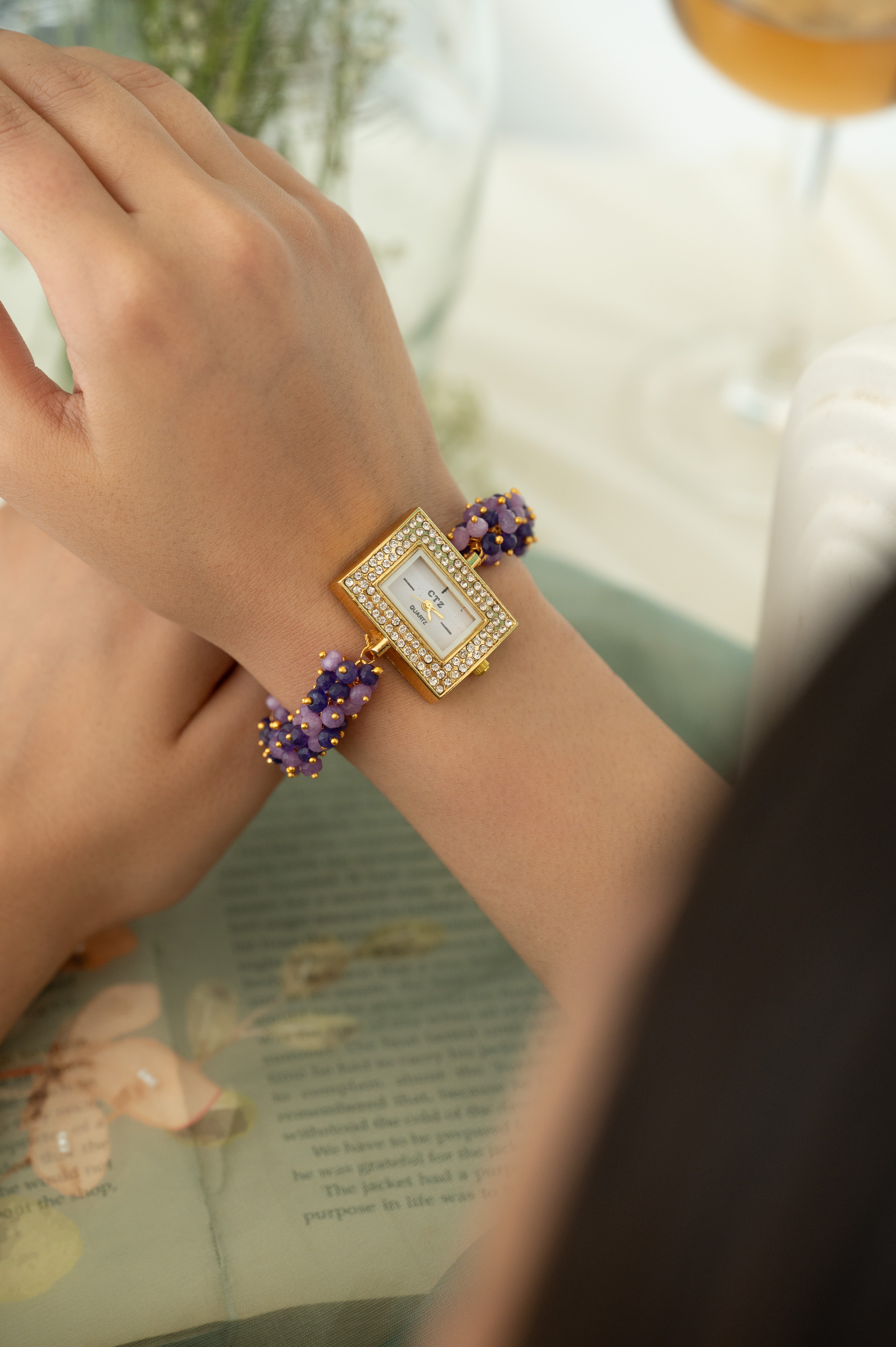 Add timeless elegance to your style with this handcrafted quartz watch bracelet. Featuring a gold-plated rectangular dial encrusted with sparkling crystals and a hand-beaded purple gemstone strap, this designer watch blends the beauty of jewelry with everyday functionality.