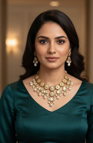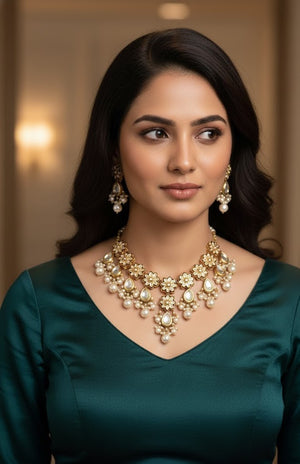 Elevate your style with this exquisite Designer Kundan Necklace set. Its intricate craftsmanship and regal charm make it the perfect statement piece