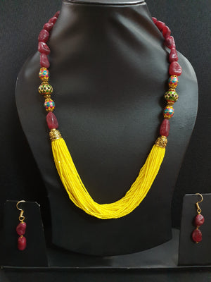 Maroon Jadau Beads Yellow Seed Bead Necklace Set