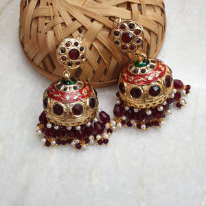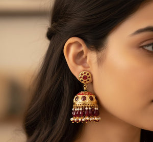 An elegant maroon stone Jadau earrings with the most stunning festoon. The perfect accessory for your occasion. This earrings are handcrafted with love