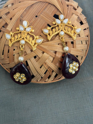 Maroon Stone Gold Matte Pearl Drop Earrings
