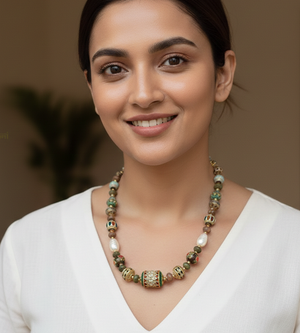 Styling: These are the perfect accessories to accentuate the elegance of your traditional outfit, furthermore, adding a perfect pop of color and edginess. The beautiful elements of the necklace go well with the saree or any western dress. A statement necklace is enough to turn the entire outfit look amazing. It looks better with a solid color outfit or pastel outfit.