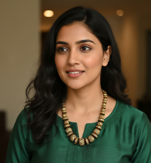 Styling: These are the perfect accessories to accentuate the elegance of your traditional outfit, furthermore, adding a perfect pop of color and edginess. The beautiful elements of the necklace go well with the saree or any western dress. A statement necklace is enough to turn the entire outfit look amazing. It looks better with a solid color outfit or pastel outfit.