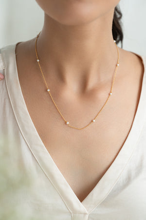 Add a touch of elegance to your everyday look with this minimal gold chain pearl necklace. Featuring dainty pearls spaced delicately on a sleek gold-toned chain, this necklace is designed for women who love understated sophistication. Perfect for daily wear, office looks, or layering with other necklaces for a chic modern style.