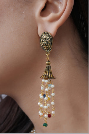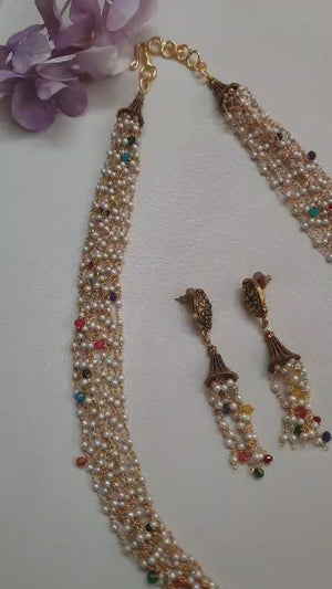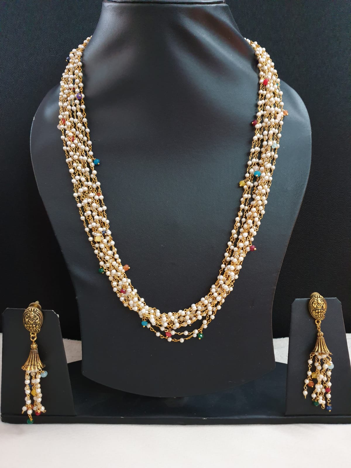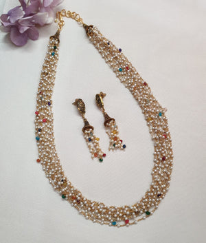 Multi Color Small Pearl Beaded Necklace With Earrings