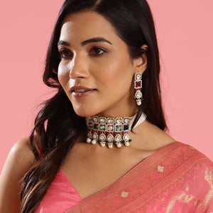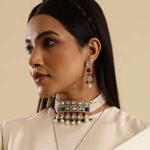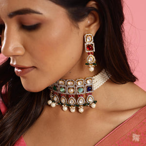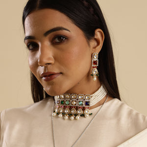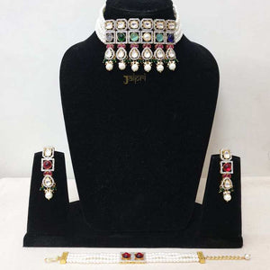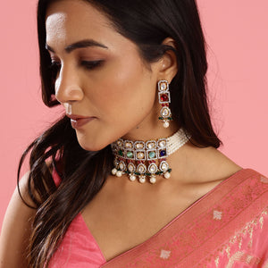 Multicolor Stone Pearl Choker Necklace and Earrings With Bracelet