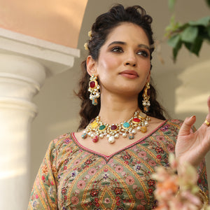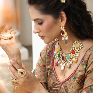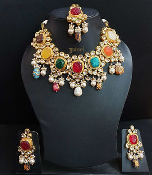 Navratana Stone Kundan Designer Necklace and Earrings With Maang Tikka