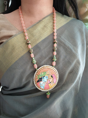Peach Stone Handpainted Radha Krishna Set With Earrings