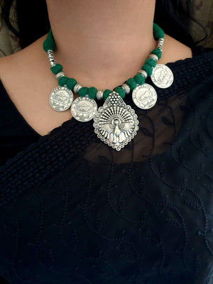 Peacock Green Thread Oxidised Necklace Set
