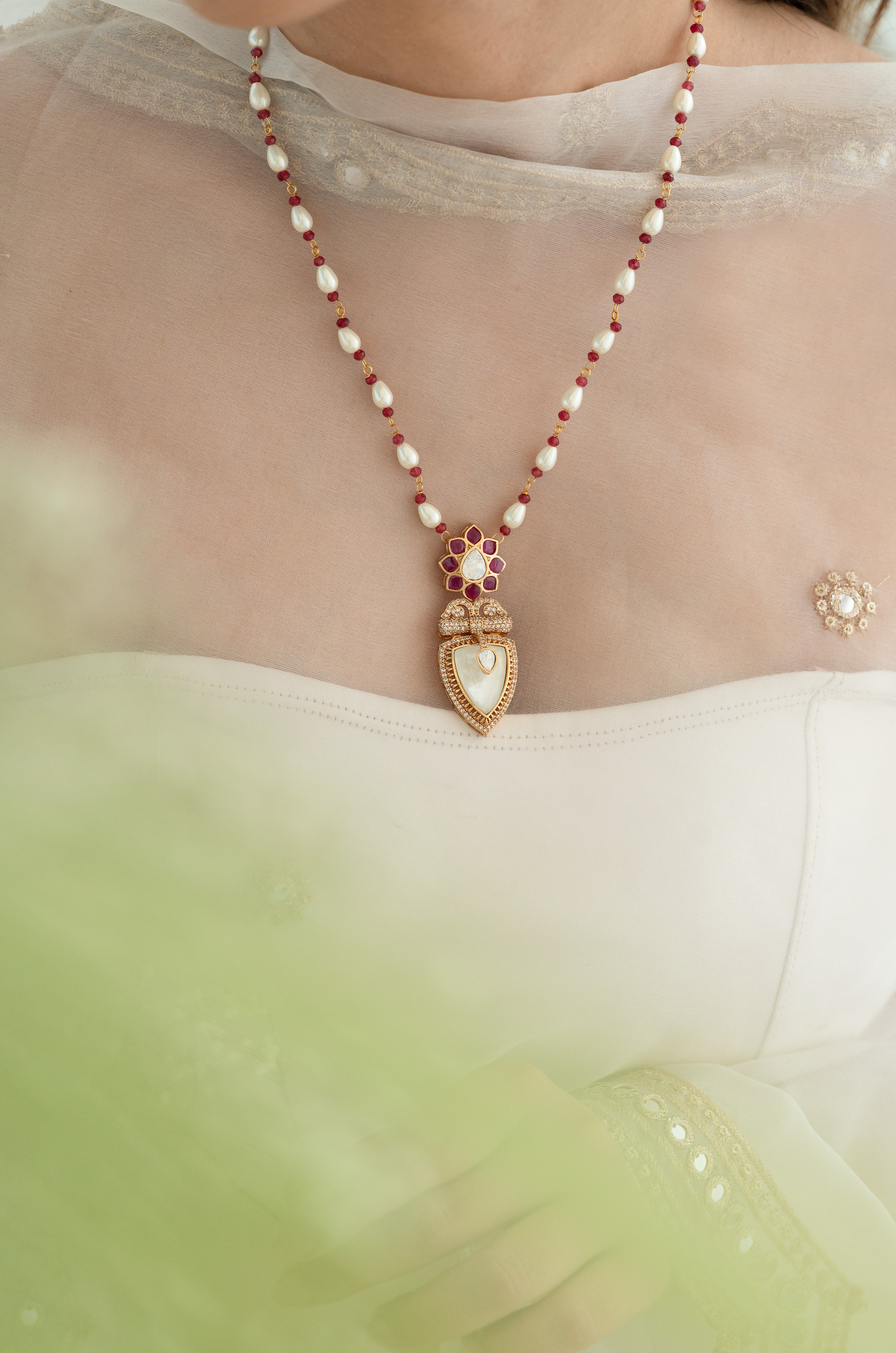 - Pearl & ruby bead chain with handcrafted detailing
