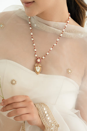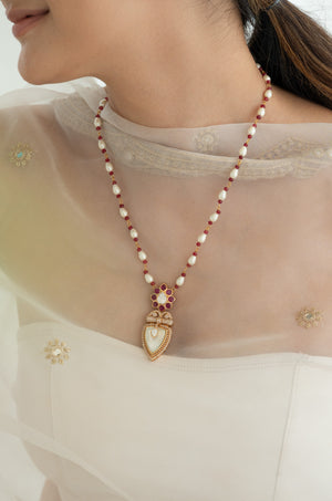 Add timeless elegance to your festive and bridal looks with this handcrafted pearl & ruby beaded necklace. The design features a gold-plated kundan floral pendant set with ruby-red accents and a teardrop centerpiece adorned with mother-of-pearl and crystal detailing.