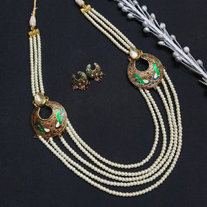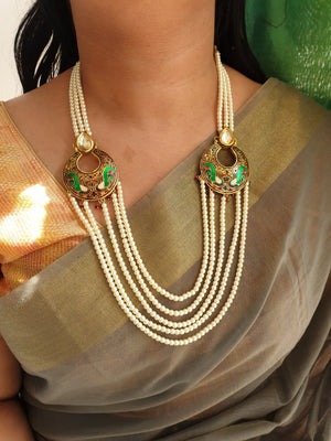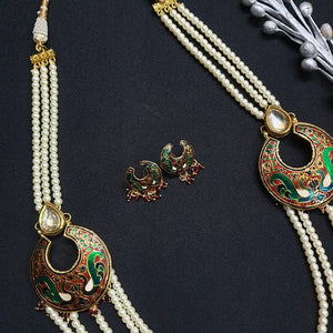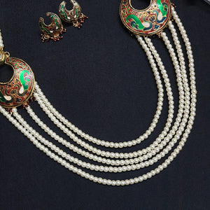 An elegant pearl beaded meenakari necklace with the most stunning festoon. The perfect accessory for your occasion. This necklace is handcrafted with love