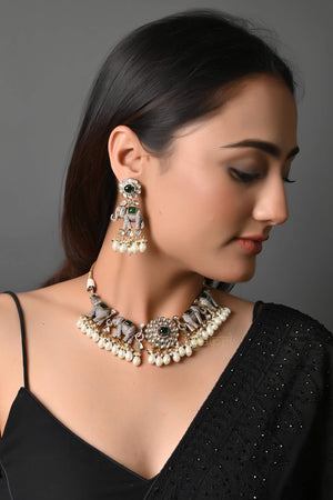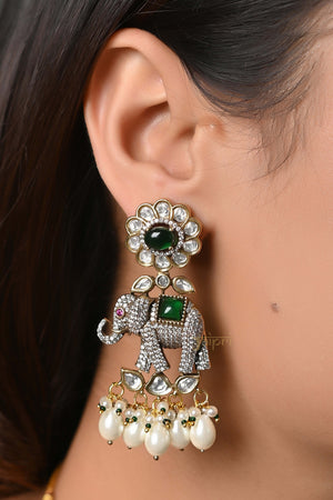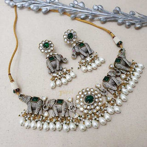 Pearl & Green Stone Elephant Design Necklace With Earrings
