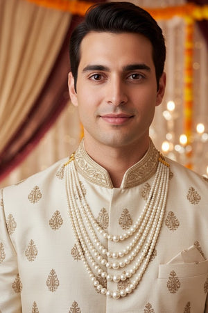 Styling: These are the perfect accessories to accentuate the elegance of your traditional outfit, furthermore, adding a perfect pop of color and edginess. The beautiful elements of the necklace go well with the sherwani or narrow jacket. A statement groom necklace is enough to turn the entire outfit look amazing. It looks better with a solid color outfit or pastel outfit.