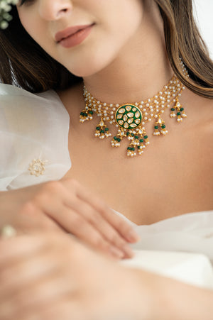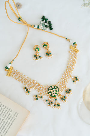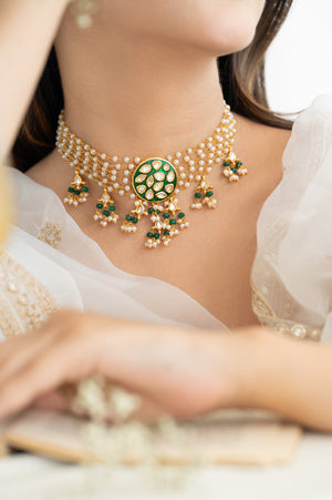 Pearl Kundan Choker Necklace Set with Green Beaded Drops