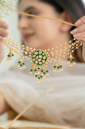 This piece beautifully blends heritage kundan work with elegant pearl strands and green accents—perfect for elevating lehengas, sarees, or Indo-western looks with a touch of royalty.