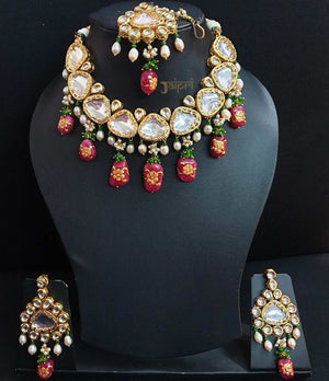 Pearl & Ruby Stone Kundan-Jadau Choker & Maang Tikka With Earrings