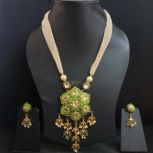 Pearl Stone & Green Meenakari Gold Pendant With Earrings