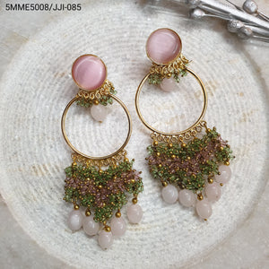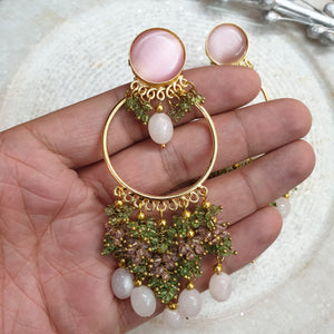 Rose Quartz and Green Beaded Hoop Earrings