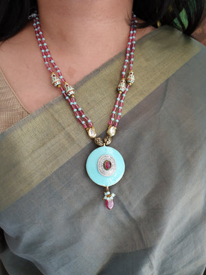 An elegant pink beads stone fusion pendant with the most stunning festoon. The perfect accessory for your occasion. This necklace is handcrafted with love