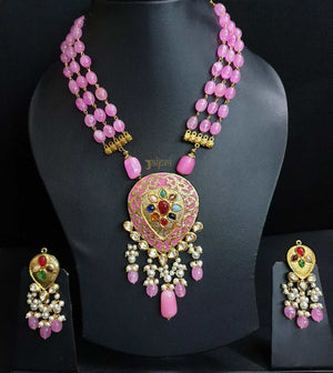 Pink Beads Stone Meenakari Tear-Drop Pendant With Earrings