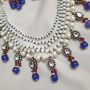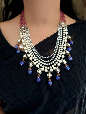 Pink Blue Beaded Kundan Polki Rani Haar Necklace