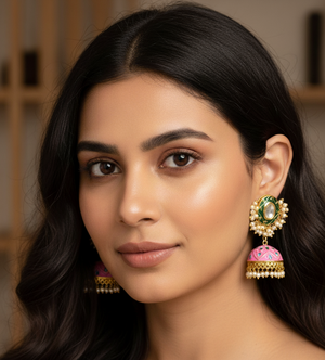 Pink Green Handpainted Jhumki Kundan Earrings