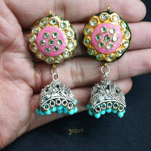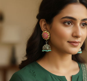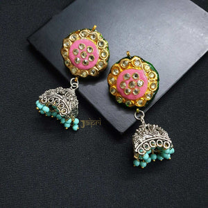 Pink Meenakari Oxidised Silver Jhumki Earrings