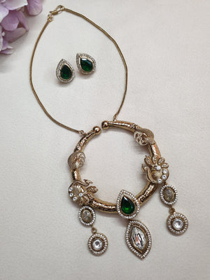 Gold Tone Kundan Fusion Green Stone Pendant Set