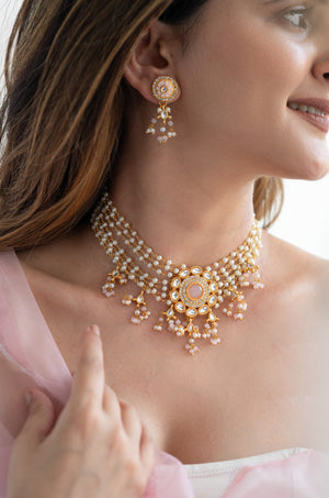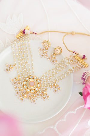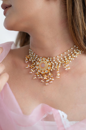 Pink Stone Kundan Pearl Beaded Choker Necklace Set