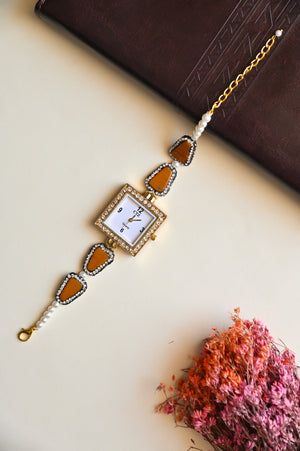 Enhance your style with our Jadau Beads Peacock Dial Wrist Watch. This exquisite timepiece features intricate peacock designs and traditional craftsmanship, perfect for any occasion