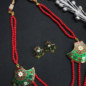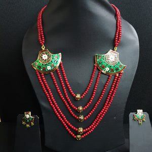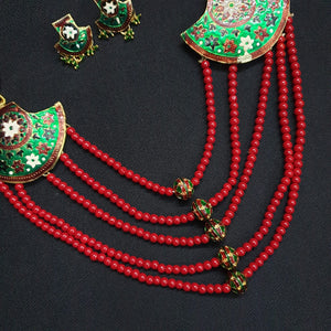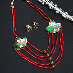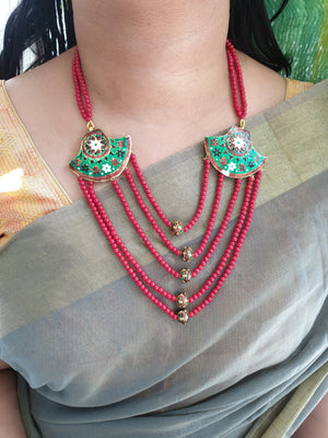 An elegant red beaded meenakari necklace with the most stunning festoon. The perfect accessory for your occasion. This necklace is handcrafted with love