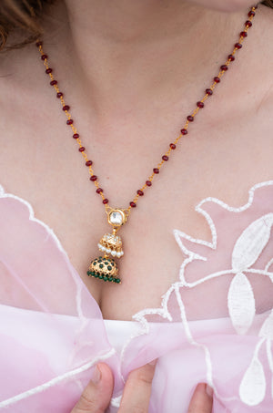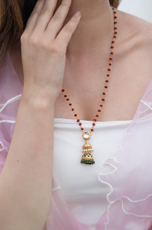 Celebrate tradition with elegance in this handcrafted festive kundan pendant necklace. Featuring a jadau kundan motif with pearl red green accents, a bold kundan pendant with crystal detailing, and a pearl-beaded chain interlinked with pearl & red green beads, this necklace is a true work of art.